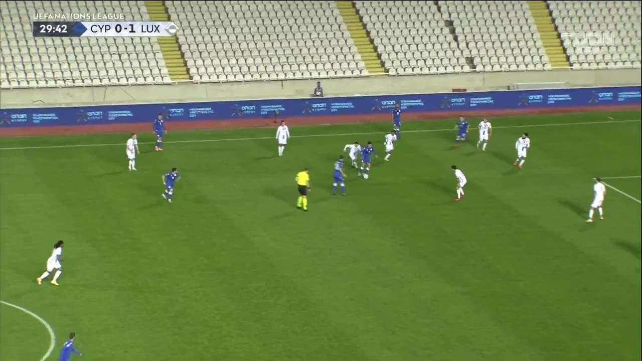Tiro atajado. Gerson Rodrigues (Luxemburgo) Disparo con la derecha desde fuera del área.