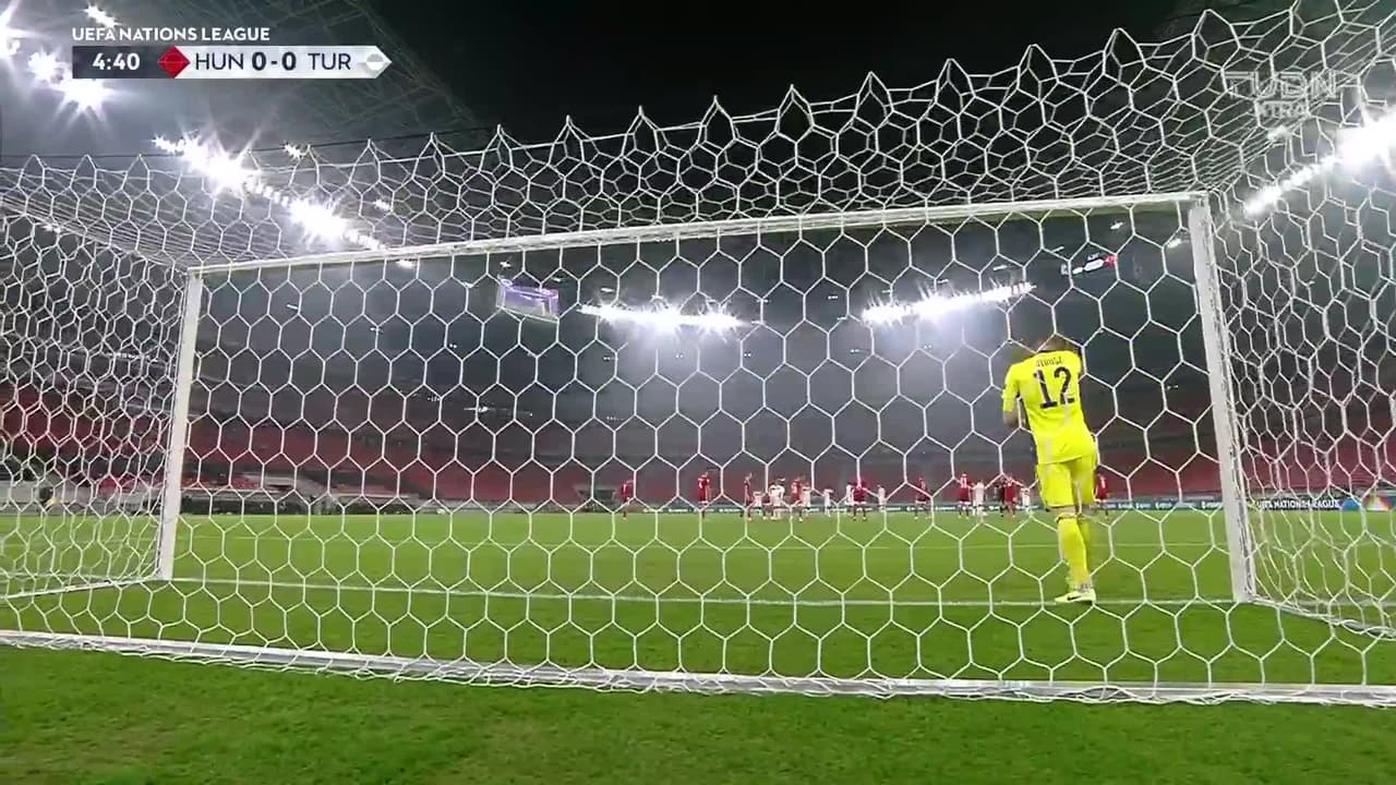 Tiro atajado raso al centro del arco. Hakan Calhanoglu (Turquía) Disparo con la derecha desde fuera del área.