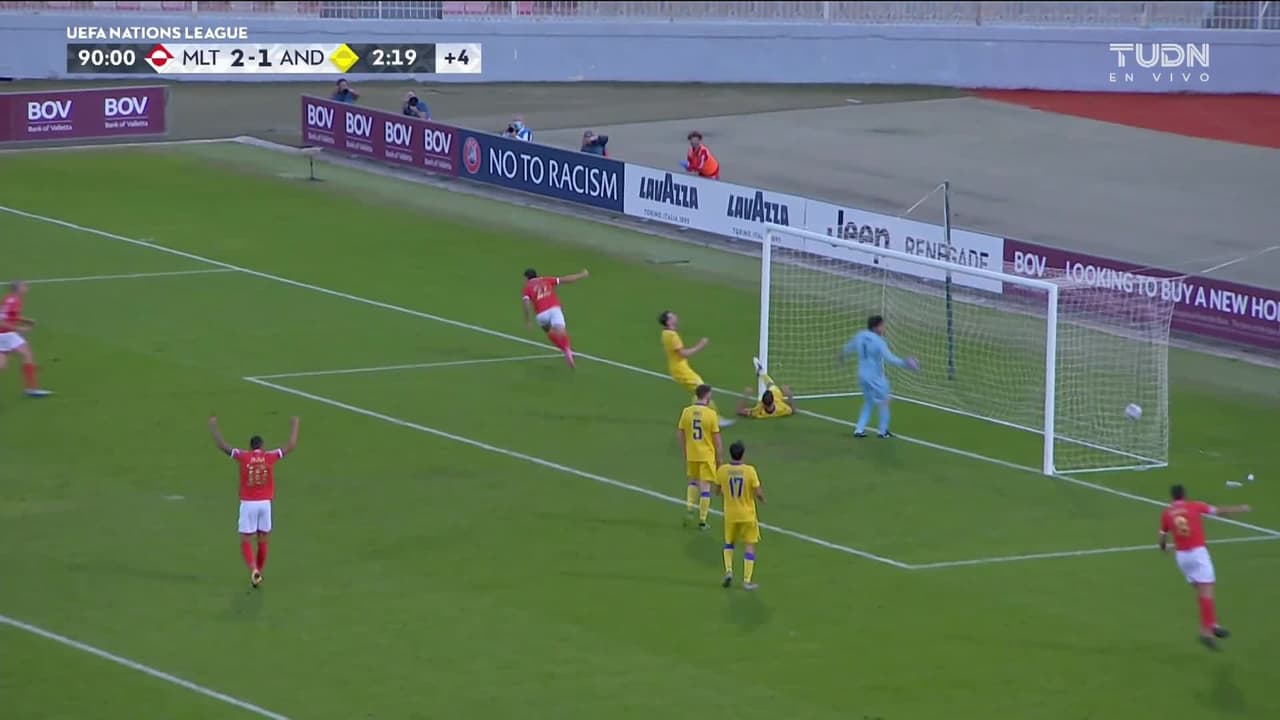 Tiro atajado por abajo a la izquierda. Jake Grech (Malta) Disparo con la derecha desde el lado derecho dentro del área. Asistencia de Alexander Satariano pase largo.