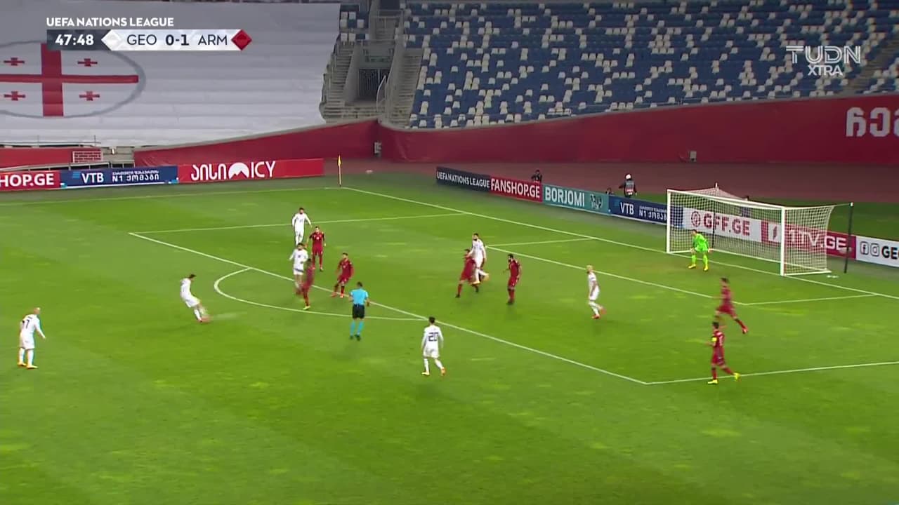 Tiro atajado raso al centro del arco. Jambul Jigauri (Georgia) zurdazo desde fuera del área. Asistencia de Valeriane Gvilia.