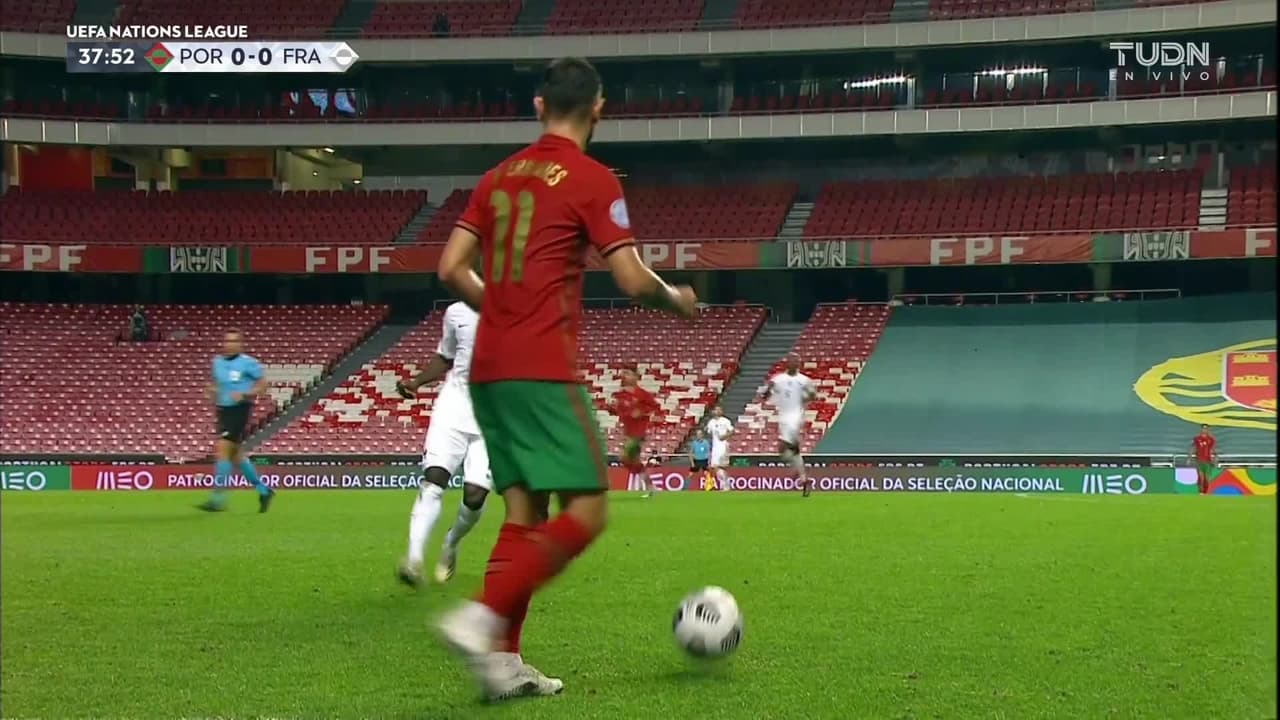 Tiro atajado junto al lado derecho de la portería. João Félix (Portugal) disparo de cabeza desde el centro del área. Asistencia de Bruno Fernandes con un centro al área.