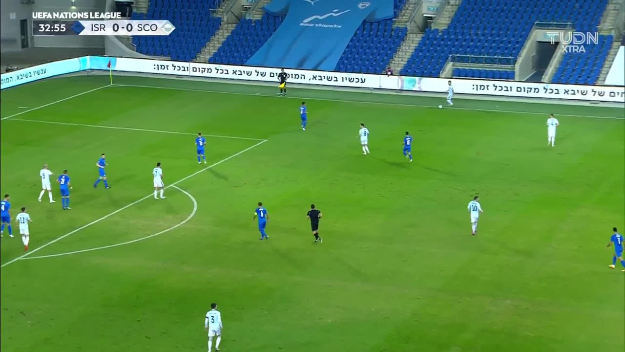 Tiro atajado al ángulo superior derecho. John McGinn (Escocia) disparo de cabeza desde el centro del área. Asistencia de Scott McTominay con un centro al área.