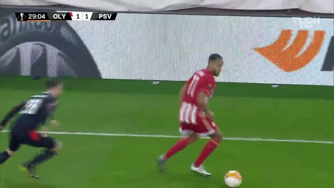 Tiro atajado. Kenny Lala (Olympiakos) Disparo con la derecha desde el lado derecho dentro del área.