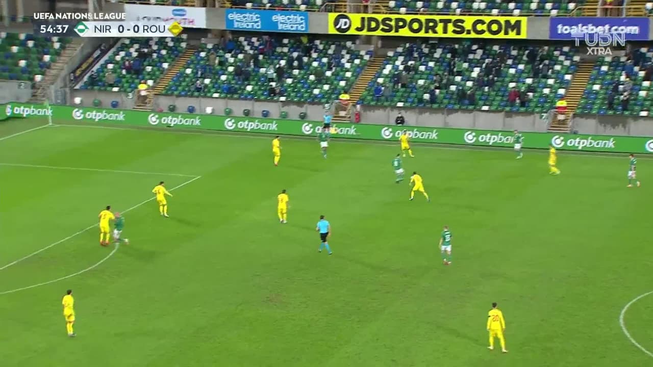 Tiro atajado. Liam Boyce (Irlanda del Norte) disparo de cabeza desde el centro del área.