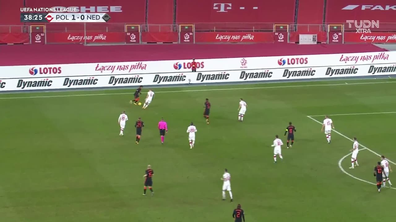 Tiro atajado junto al lado derecho de la portería. Memphis Depay (Holanda) Disparo con la derecha desde fuera del área. Asistencia de Georginio Wijnaldum.