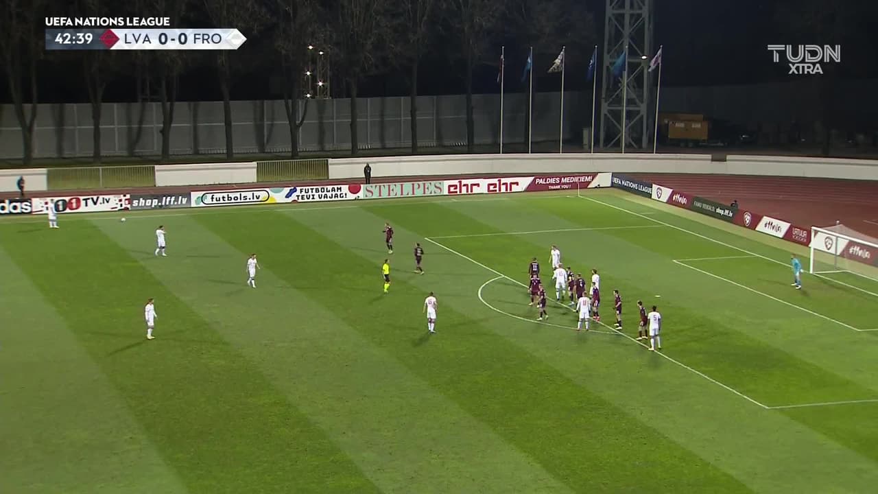 Tiro atajado por abajo a la izquierda. Odmar Faero (Islas Faroe) zurdazo desde el centro del área. Asistencia de Joannes Bjartalid con un centro al área.