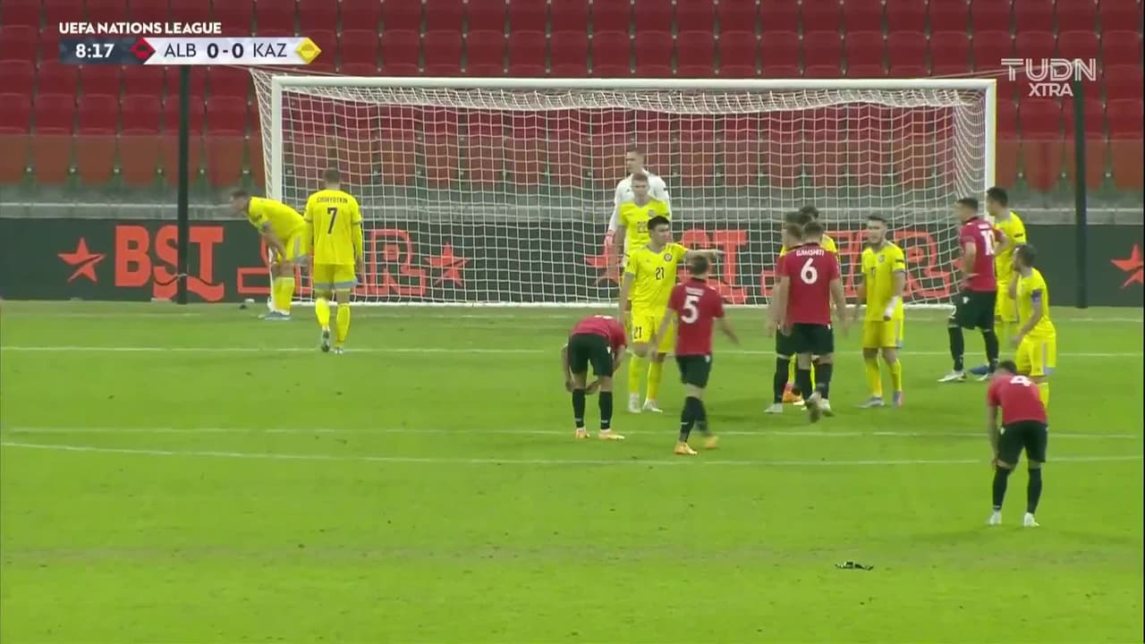 Tiro atajado Por arriba en el centro del arco. Rey Manaj (Albania) disparo de cabeza desde el centro del área. Asistencia de Ledian Memushaj con un centro al área.