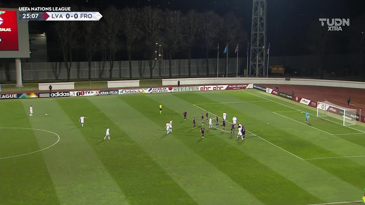 Tiro atajado. Sonni Ragnar Nattestad (Islas Faroe) disparo de cabeza desde el centro del área.