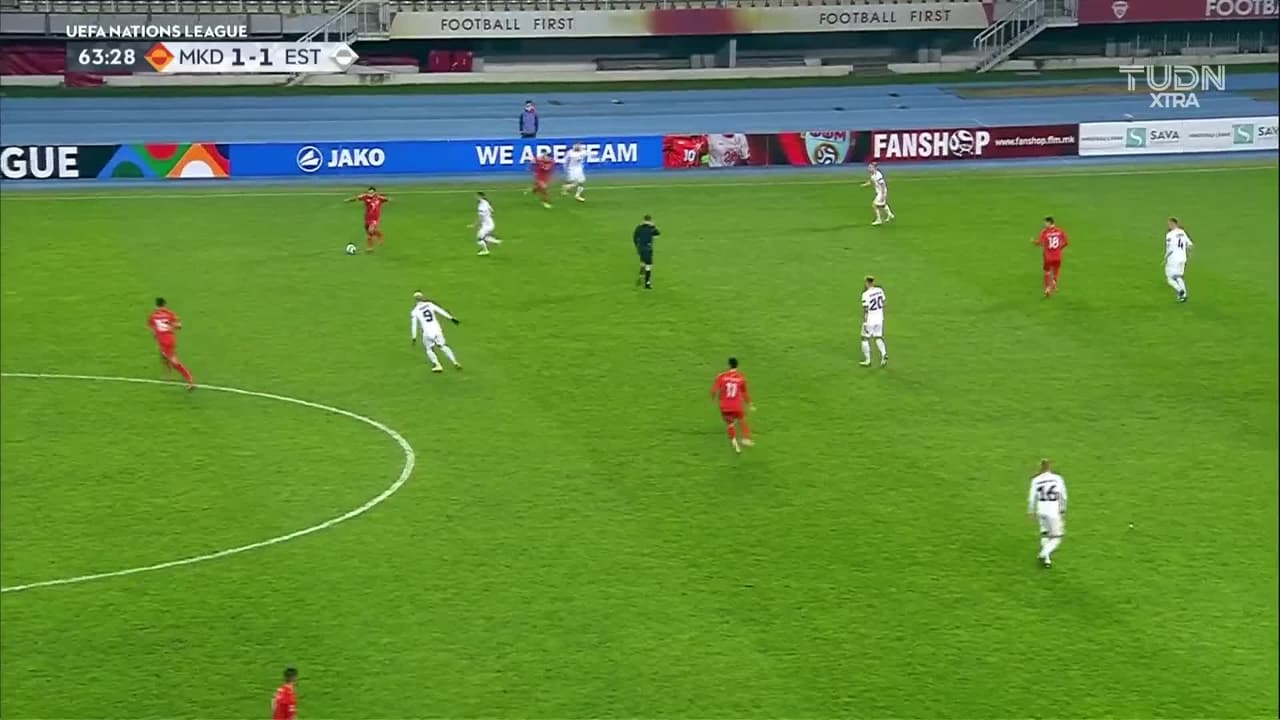 Tiro atajado por abajo a la izquierda. Stefan Ristovski (Macedonia) disparo de cabeza desde el centro del área. Asistencia de Egzon Bejtulai con un centro al área.