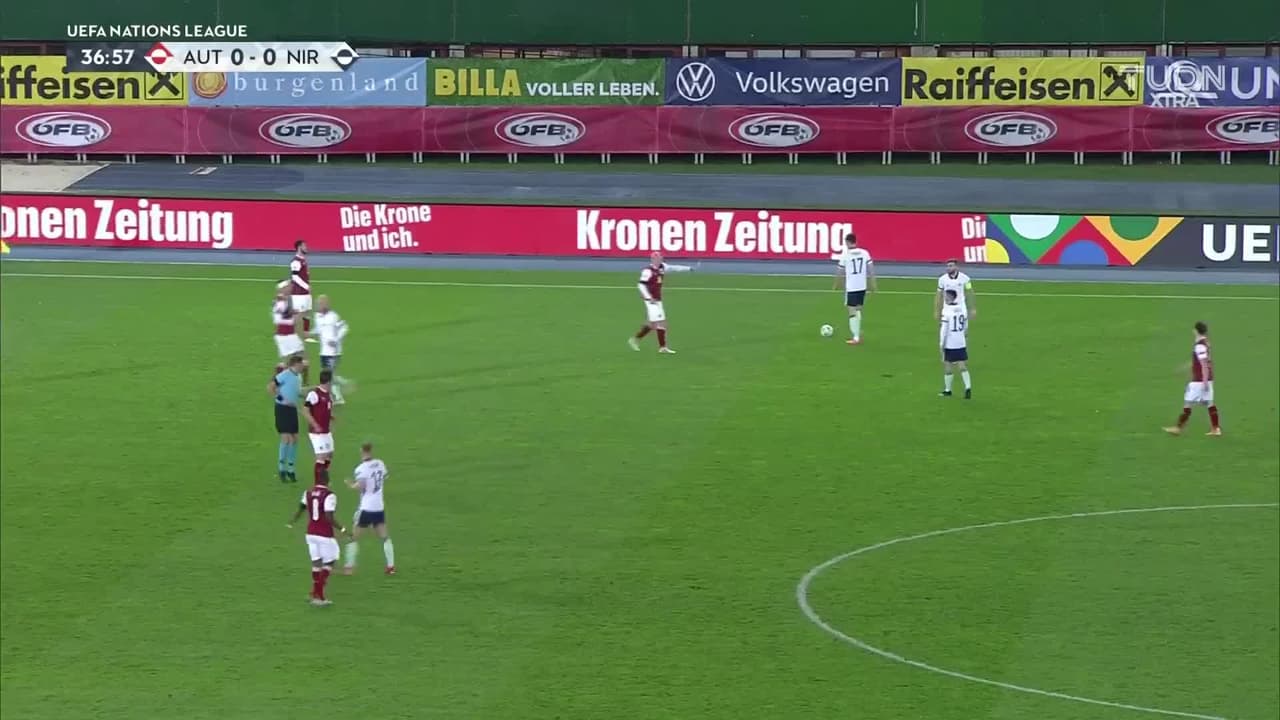Tiro atajado por abajo a la izquierda. Tom Flanagan (Irlanda del Norte) disparo de cabeza desde el centro del área. Asistencia de Patrick McNair con un centro al área.