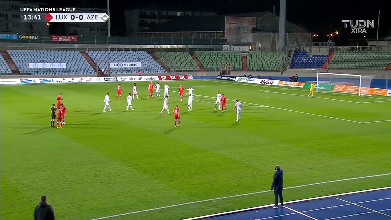 Tiro atajado junto al lado derecho de la portería. Vincent Thill (Luxemburgo) zurdazo desde más de 30 metros.