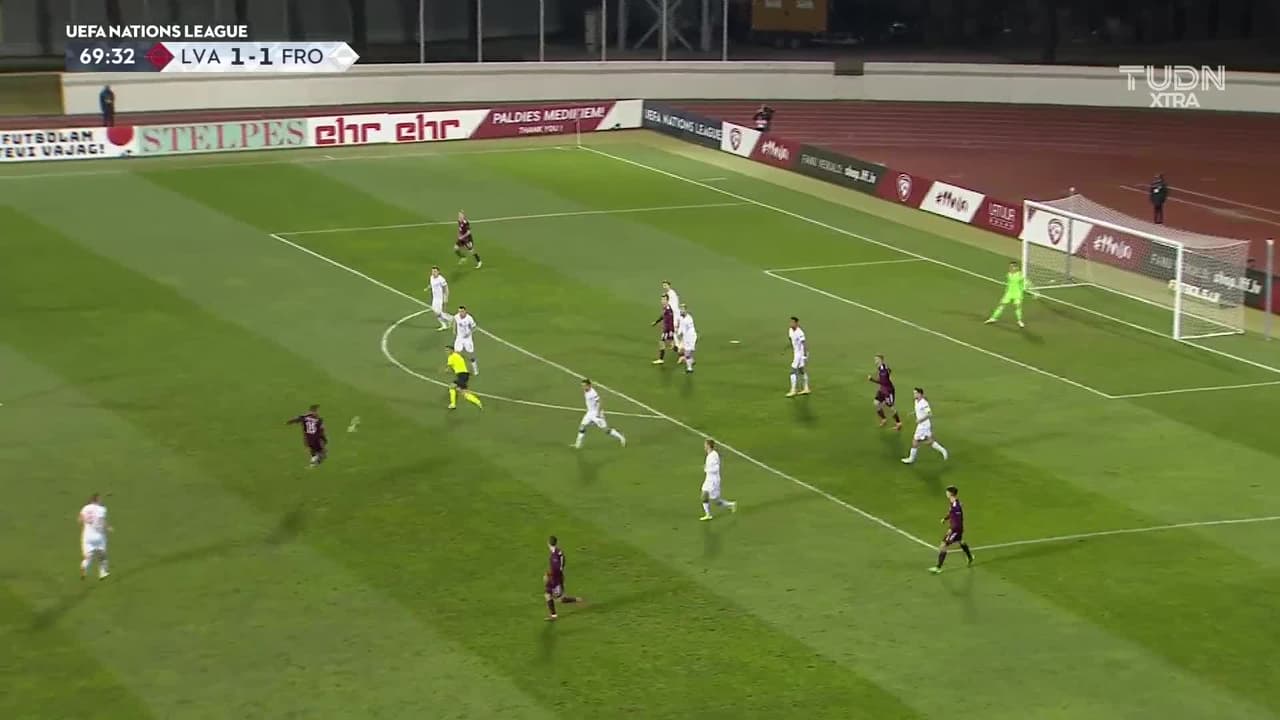 Tiro atajado raso al centro del arco. Vladislavs Gutkovskis (Letonia) Disparo con la derecha desde el lado derecho dentro del área. Asistencia de Aleksejs Saveljevs.