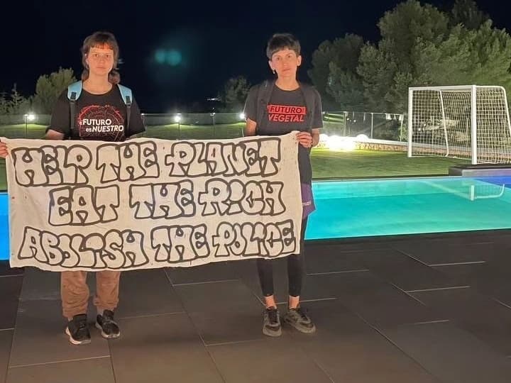 Es el segundo verano que Futuro Vegetal elige Ibiza para protagonizar sus acciones reivindicativas. La temporada pasada roció con pintura de negro las cerezas de la discoteca Pacha, irrumpió en el 'beach club' de lujo Blue Marlin de Cala Jondal con pancartas de protesta con el lema: ‘Your luxury our climate crisis’ (tu lujo, nuestra crisis climática).
