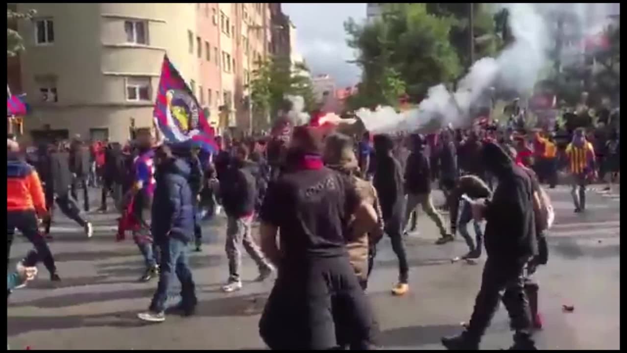 Y eso que ganaron: con piedras, bengalas y botellas se enfrentaron los ultras del Barça con la policía