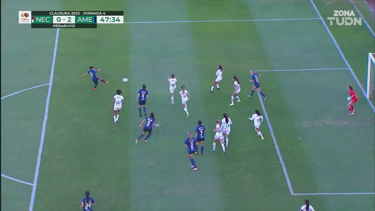 Nati prende el balón con la pierda zurda buscando anotar, pero la guardameta necaxista recorrió bien su cabaña.