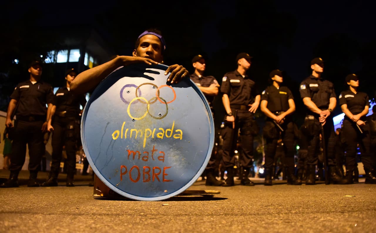 Un manifestante en contra de los juegos Olímpicos, fuera del estadio Maracaná, lleva un cartel en el que se lee “Olimpiada mata pobre”.