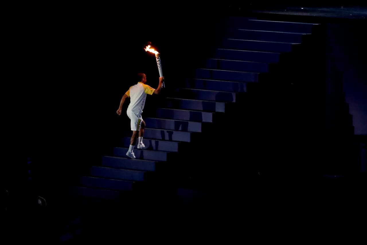 Vanderlei de Lima, reconocido atleta brasileño lleva la antorcha hasta el pebetero del estadio Maracaná.