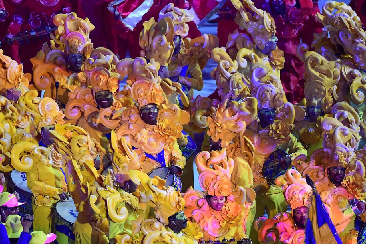 Musicos y bailarines, pertenecientes a varias escuelas de Samba de Río de Janeiro, participan en el espectáculo.