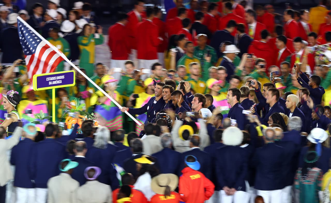 La delegación de Estados Unidos, lideradas por Michael Phelps, desfila en la ceremonia inaugural de los juegos.