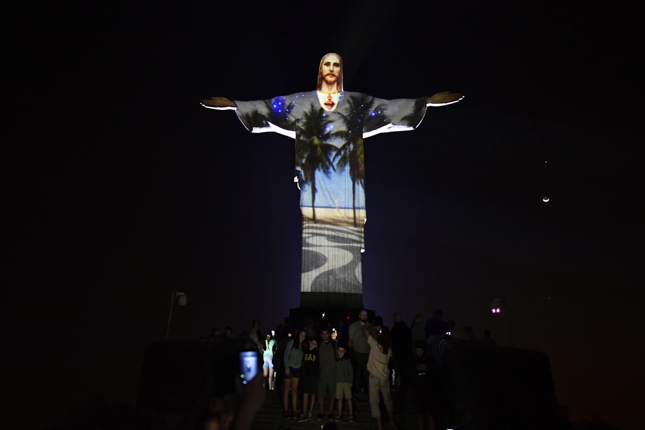 El cristo de Corcovado espera por el comienzo de la ceremonia inaugural al anochecer del 5 agosto. Sobre el monumento se proyectan imágenes realizadas por el artista francés Gaspare Di Caro.