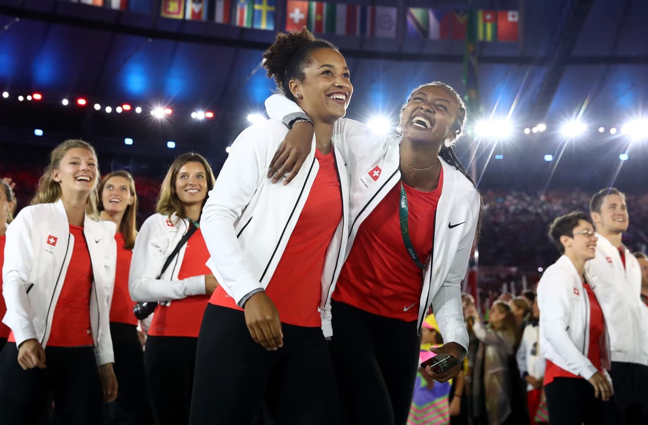 Miembros del equipo de Suiza desfilan en la ceremonia inaugural, un momento relajado para todos los atletas.