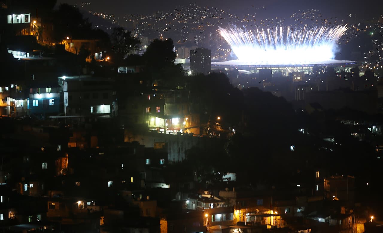 Comienza el espectáculo inaugural en el Maracaná. Las favelas de Río en la noche del 5 de agosto, al fondo el estadio iluminado por los fuegos artificiales.