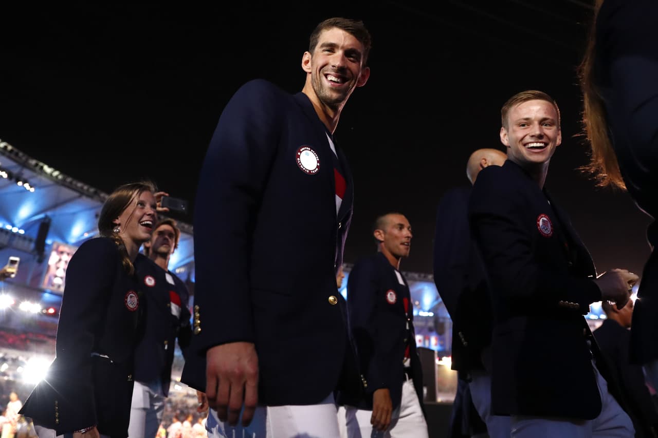 El atleta con más medallas en la historia de los Juegos Olímpicos, Michael Phelps, abanderado de Estados Unidos, disfruta del espectáculo inaugural.