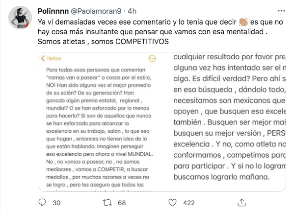 “Antes de criticar cualquier resultado, por favor pregúntate si alguna vez has intentado ser el mejor en algo. Es difícil, ¿verdad?”, tuiteó Paola Morán, de 24 años de edad.