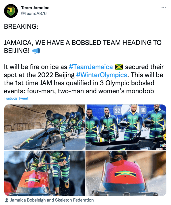 “¡Jamaica, tenemos un equipo de bobsled dirigido a Beijing! Será fuego sobre hielo ya que Team Jamaica aseguró su lugar en Beijing 2022. Esta será la primera vez que se clasifique en 3 eventos olímpicos de trineo: monobob de cuatro hombres, dos hombres y mujeres”, tuiteó la delegación olímpica de Jamaica.