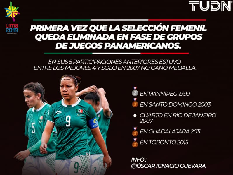 Es la primera vez que la Selección Femenil queda eliminada en fase de grupos de Juegos Panamericanos. En sus 5 participaciones anteriores estuvo entre los mejores 4 y solo en 2007 no ganó medalla.