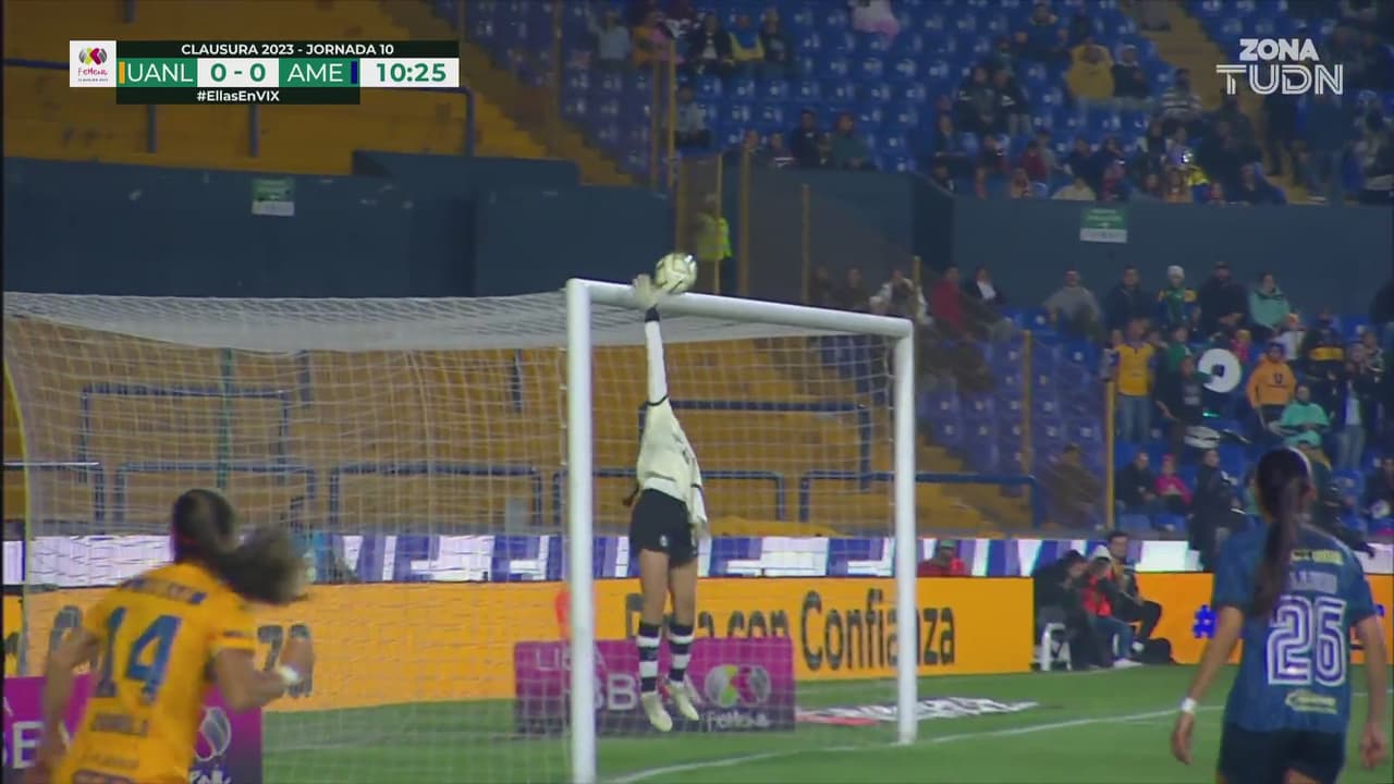 Itzel Velasco se equivocó en la salida, el balón le quedó a la ‘Maga’, quien casi se manda un golazo al 10’.
