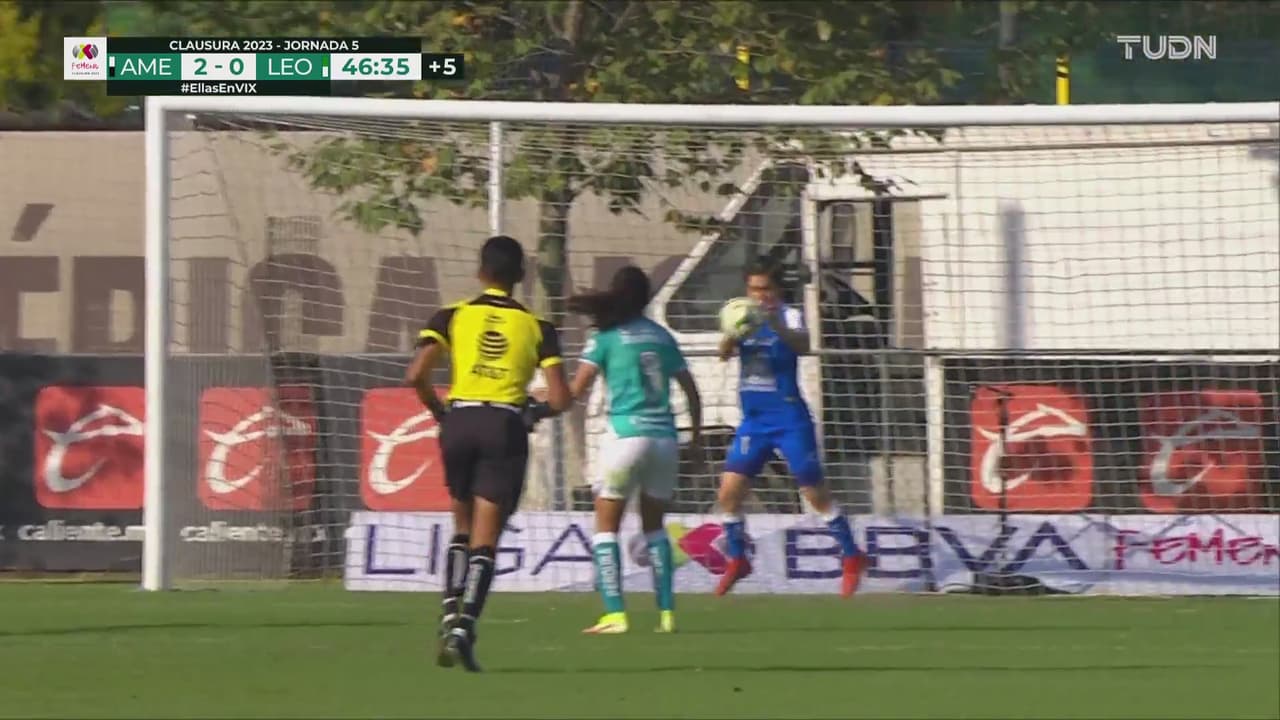 Kiana se anima a pegarle fuera del área, pero la guardameta de León estaba atenta para atajar al 45+2’.