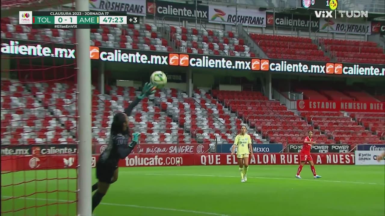 Tras recuperar la esférica, Becerril disparó a meta que atajó la portera de América y Mariel no pudo firmarla teniéndola en los pies.