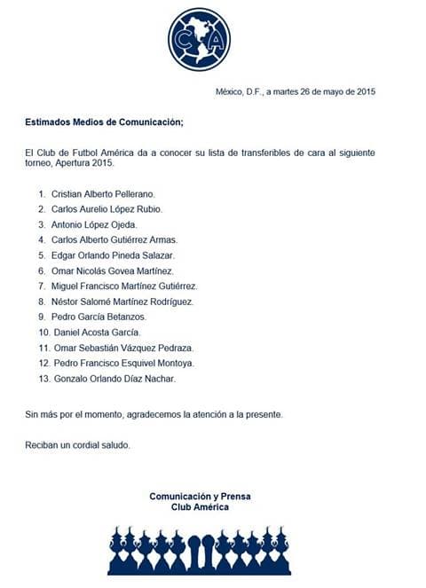 Luego de que el América anunciará que Nacho Ambriz será el nuevo estratega de las Águilas, el equipo de Coapa anunció su lista de trasferibles de cara al próximo torneo.