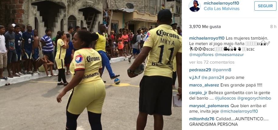 "Las mujeres también le meten al jogo majo ñaña", se lee en una de las fotos que posteó, donde se ven a varias personas portando la playera de las Águilas y a una mujer de espaldas disfrutando de la famosa cascarita que se armó gracias a la solidaridad del jugador de Coapa.
