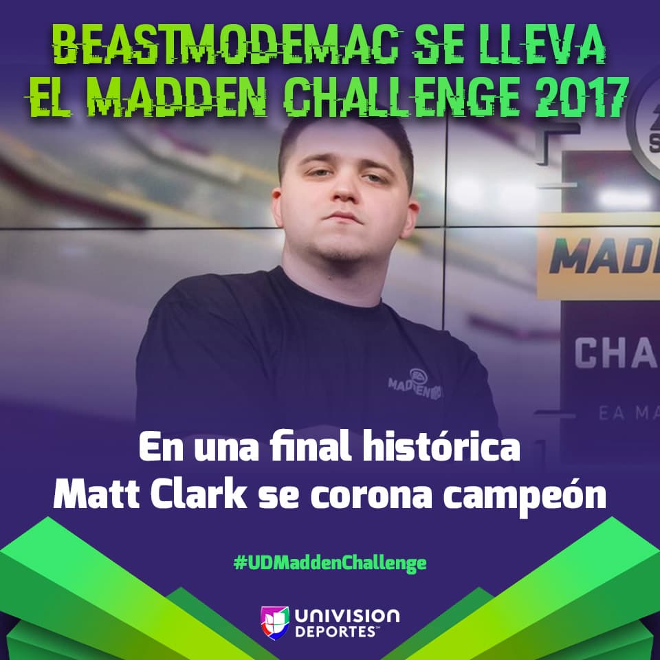 A pesar de no llegar a las finales del Madden Bowl en febrero de este año Matt "BeastModeMac" Clark se coronó campeón del Madden Challenge 2017 con un marcador de 16-10 frente al favorito Skimbo.