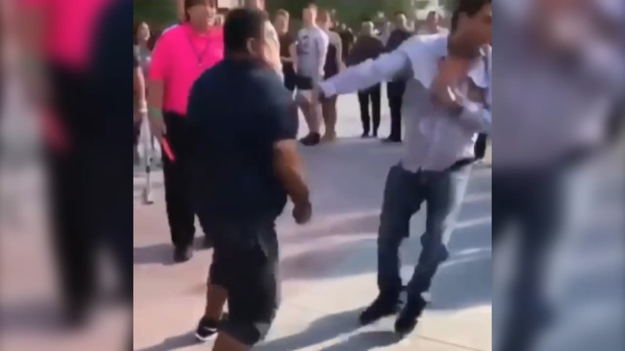 Animados por los gritos de “¡Canelo, Canelo!”, dos aficionados, al parecer de diferentes bandos, se agarraron a golpes en las inmediaciones de la T-Mobile Arena a horas de la pelea de revancha.