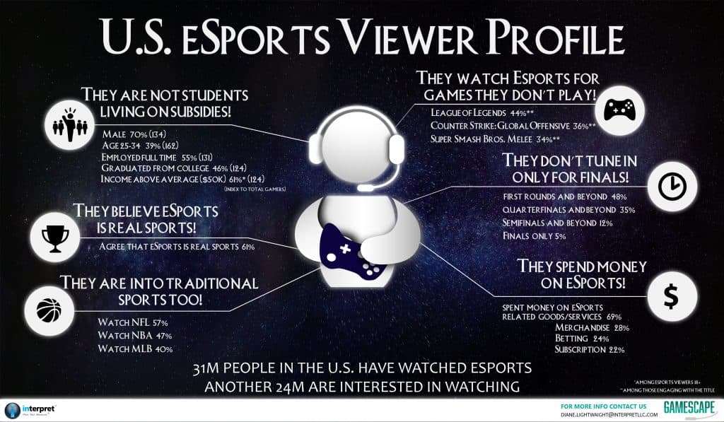 Además se demostró que más de la mitad de de estos —31 millones en Estados Unidos— son personas con estudios y trabajo —por lo menos universidad y empleos de medio tiempo—. Sumado a esto se encontró que el gusto por mirar eSports podría estar relacionado con los deportes tradicionales, pues el 57% de personas que ven eSports también ven la NFL, mientras de un 47% es aficionada también al baloncesto.