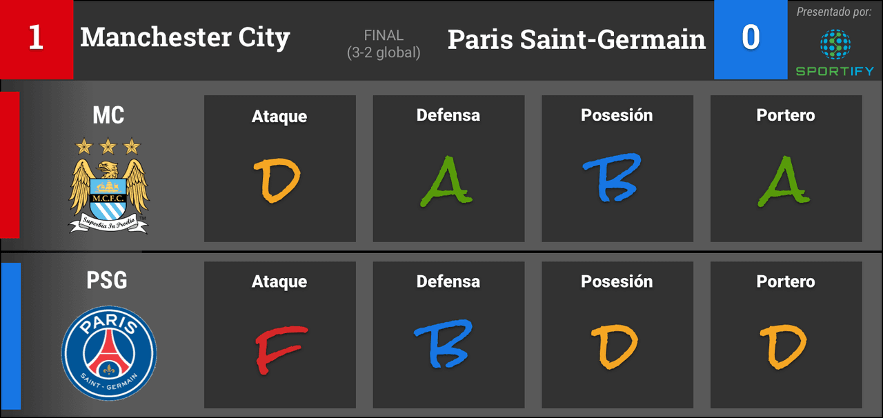 En el choque entre los equipos millonarios, el Manchester City derrotó al Paris Saint-Germain con un marcador de 1 a 0 (3-2 global). Esta es la primera vez en su historia que el Manchester City avanza a semifinales de la Champions League.