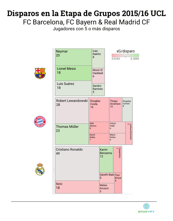 El tamaño de cada rectángulo muestra el número de disparos tomados por cada jugador. El color del rectángulo es determinado por el valor de la expectativa de gol (xG) de cada disparo realizado por el jugador - verde significa una mejor calidad, rosa significa menor calidad. Esta visualización facilita la comparación entre los compañeros de equipo y sus contrapartes.