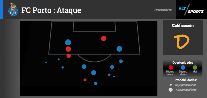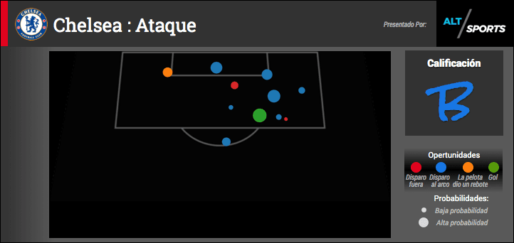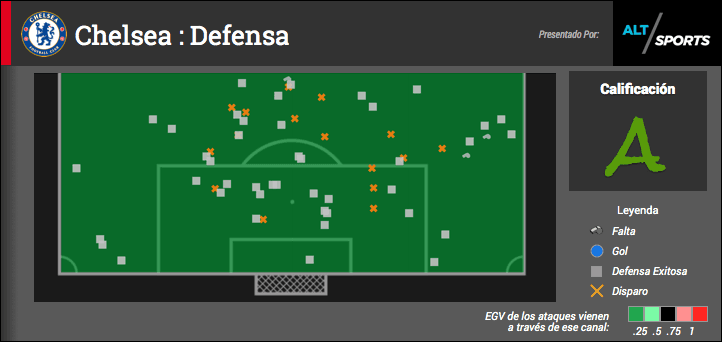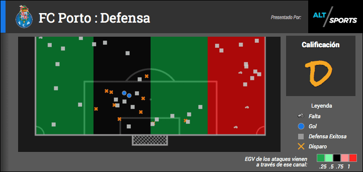 Aunque los azules sólo lograron 11 tiros, merecieron la calificación de B en su ataque ya que estas oportunidades fueron en general buenas. La mayoría de los intentos del Chelsea llegaron desde el costado derecho, pero fue el flanco izquierdo en donde centraron su ataque. El lado derecho de la defensa de Porto se ve de color rojo que significa que los ataques a través de ese carril tuvieron un EGV superior a 1.