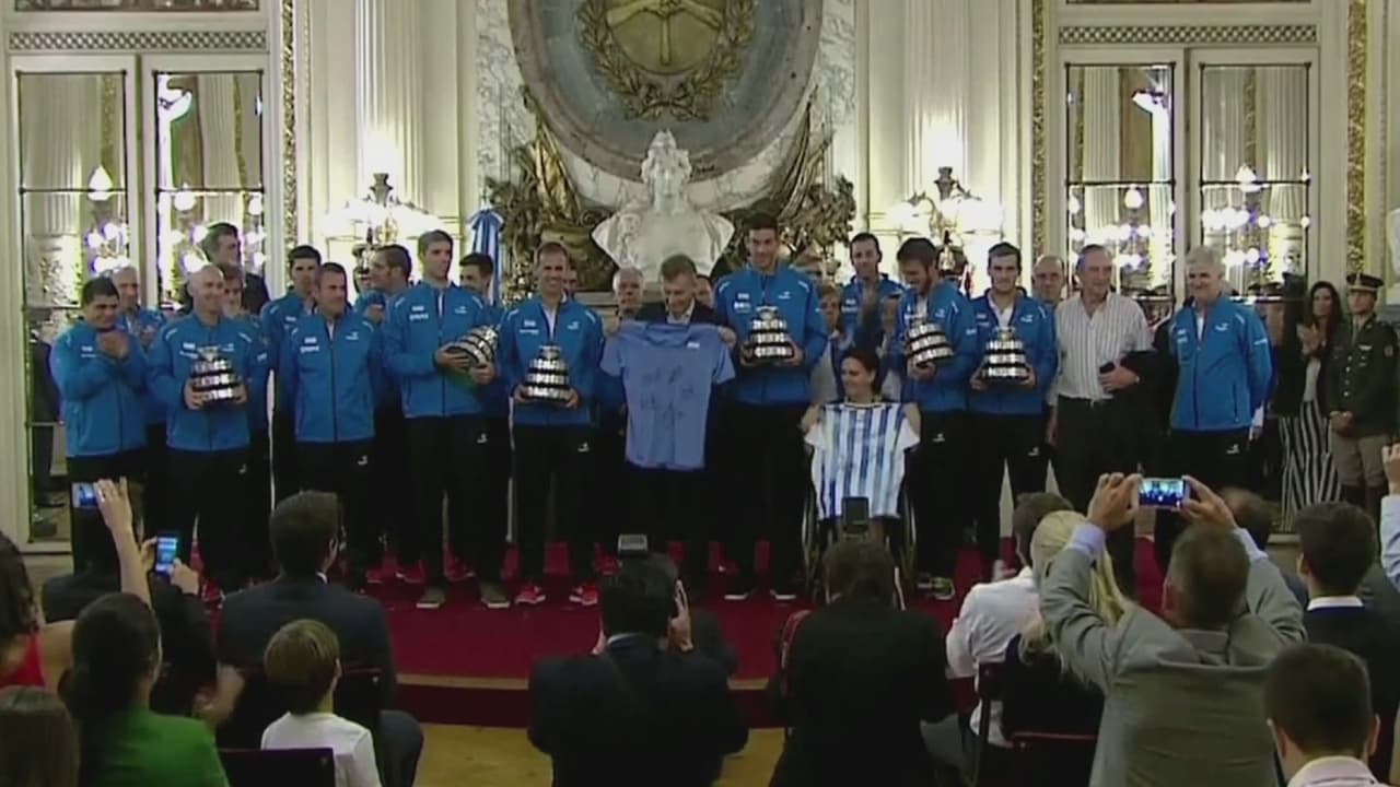 Los jugadores que lograron la hazaña para el tenis argentino, con Del Potro a la cabeza, fueron agasajados por Mauricio Macri en la Casa Rosada, la sede del gobierno.