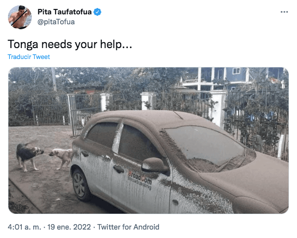 Las primeras imágenes desde tierra de la capital, Nukualofa, publicadas el miércoles en Twitter por el Consulado de Tonga muestran coches cubiertos de gruesas capas de ceniza marrón, árboles derribados y escombros, y un par de niños jugando entre un paisaje de total destrucción.
