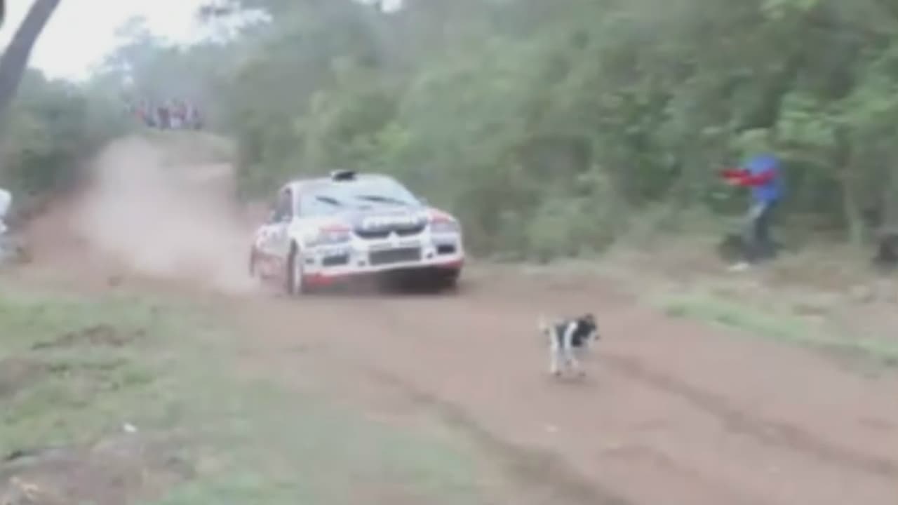 Este perrito soñaba con ser corredor de autos y se paseó por la pista del Rally Codasur de Santa Cruz, Bolivia. Si fuera un gato ya se habría consumido una de las nueve vidas.