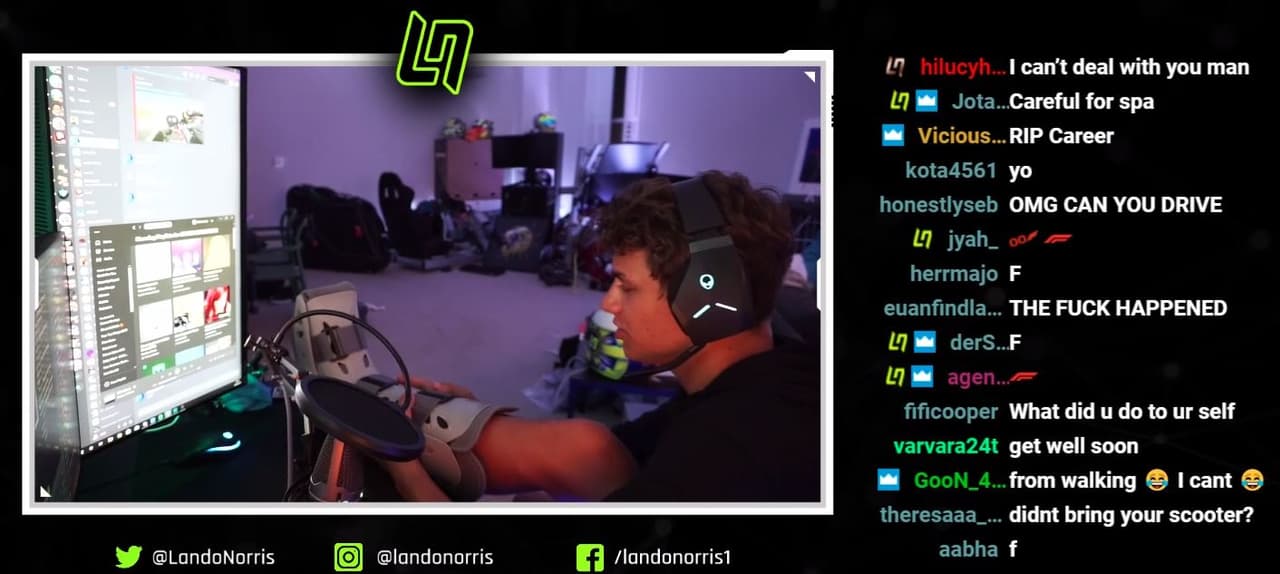 “¿Ya vieron?”, dijo el piloto, “Tengo una férula en la pierna. Caminé mucho hoy y estoy lesionado… duele” comentó en su streaming, donde suele conectarse y organizar salas de videojuegos de disparos y carreras.