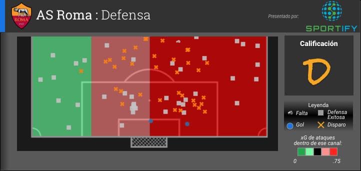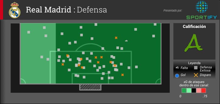 La defensa del Roma ugo retrasada hasta que tuvo que perseguir el juego, a menudo concediendo la posesión y oportunidades de disparos desde lejos al Real Madrid. Esta estrategia se ilustra con el número relativamente pequeño de cuadros grises que representan las acciones defensivas y el hecho de que 11 de ellos son los tiros bloqueados por la defensa Romana (la mayor cantidad por cualquier equipo en esta temporada de UCL).