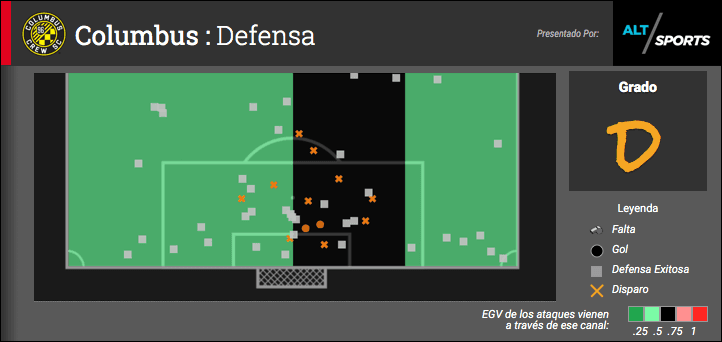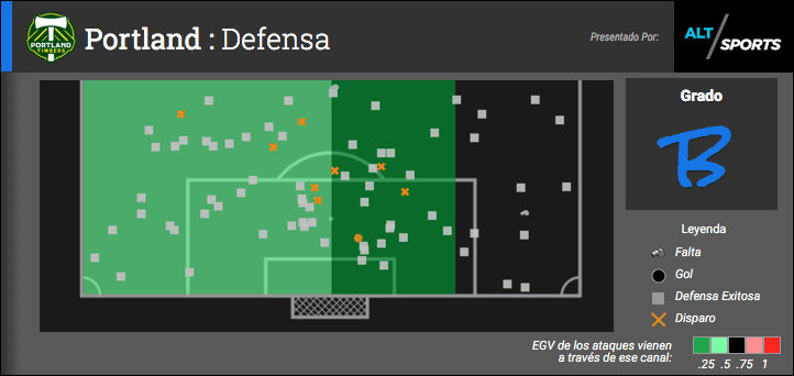 Ambos equipos hicieron bien para limitar las oportunidades de la oposición, pero la defensa de Portland fue más productiva. Diego Chara, justamente elogiado por su entrenador Caleb Porter después de la victoria, ejecuto 30 acciones defensivas exitosas durante el partido, mas que cualquier otro jugador. Portland absorbió una mayor parte del ataque del Crew, señalado en la gráfica de la defensa de Portland por los cuadros grises.