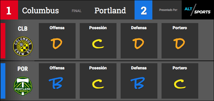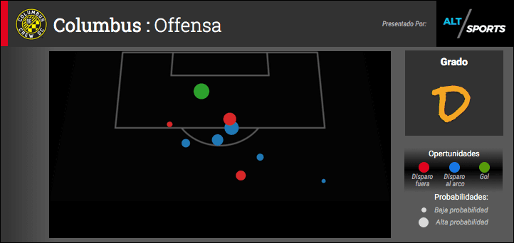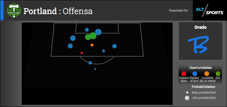 Como se muestra en la visualización de la ofensiva de Portland, los Timbers tuvieron oportunidades de más alta calidad concentradas dentro del área - todos menos dos de sus 12 disparos originaron dentro del área. (El tamaño del círculo representa la calidad de la oportunidad.) Por el contrario, Columbus fue mayormente obligado a disparar desde fuera del área. Seis de los nueve tiros del Crew se encuentran fuera del área y son círculos más pequeños, lo que representa una menor probabilidad de resultar en goles.