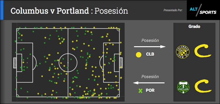 En la gráfica anterior se observa la alta concentración de puntos amarillos en el último tercio del campo – comprobando que Portland dedico suficiente tiempo conteniendo el ataque de Columbus. Los Timbers, con sus 535 toques en el partido, detuvieron la mayor parte de los 729 toques del Crew antes de que se convirtieran en oportunidades para anotar. Esa estrategia defensiva, además de los dos goles tempranos, mandaron a los Timbers a casa como campeones.