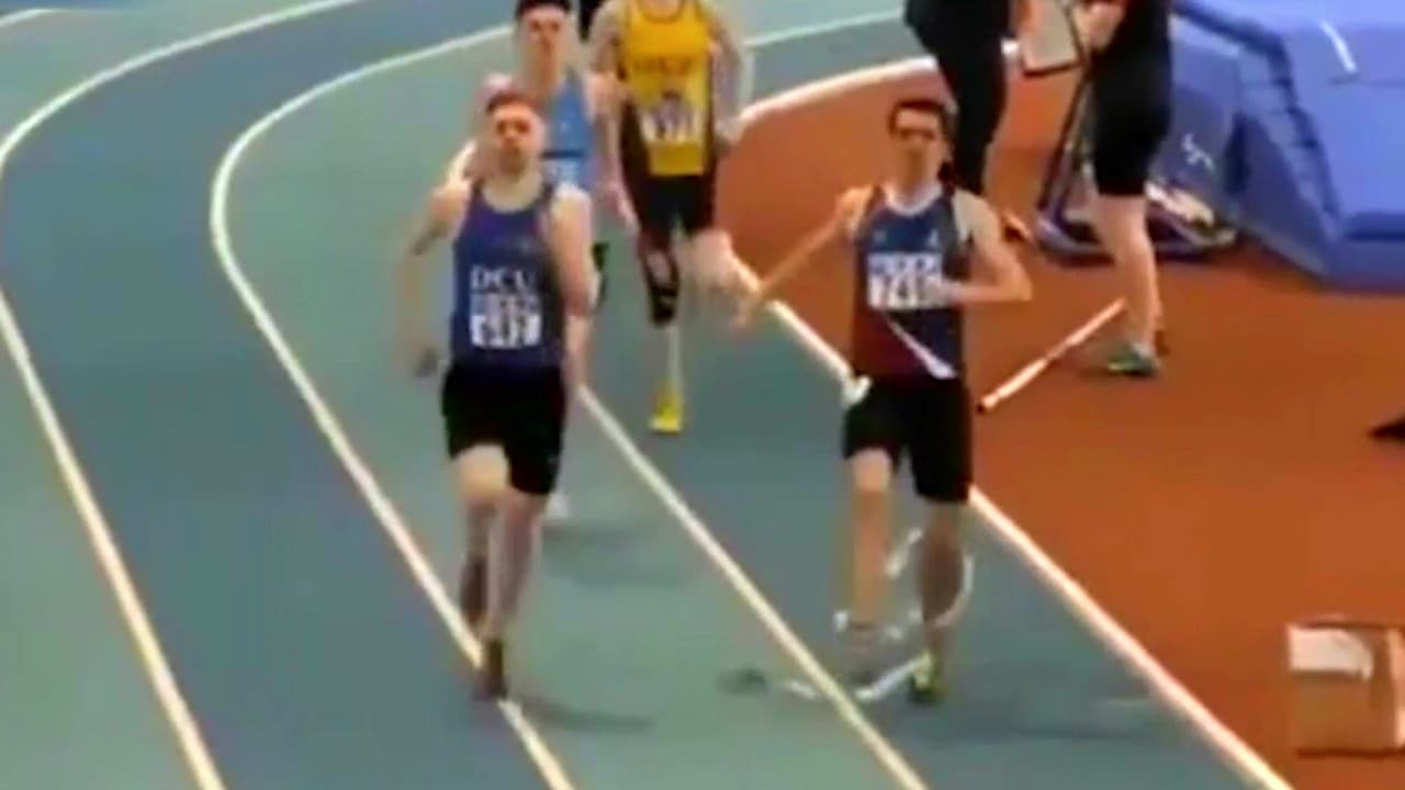 Este muchacho venía bien para llevarse una carrera de atletismo pero justo le cayó un listón de una competencia que se disputaba al lado de la pista y se le enredó en las piernas. Obvio, perdió.